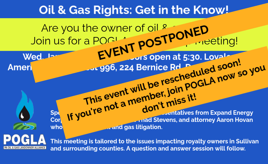 TONIGHT'S COFFEE SHOP IN SULLIVAN COUNTY IS CANCELLED DUE TO INCLEMENT WEATHER AND SPEAKER'S TRAVEL ISSUES. THE MEETING WILL BE RESCHEDULED- STAY TUNED!SULLIVAN COUNTY COFFEE SHOP January 28, 2026 at 6:00PM LUNCH AND LEARN SERIES February, 18 at 12 NOONPresenting Robert J. Burnett, Pennsylvania Oil & Gas Lawyer – Protecting Landowners: Negotiation; Leases; Royalties; Litigation; Marcellus Gas POGLA'S 13th ANNUAL MEETING AND CONFERENCE